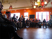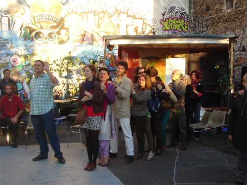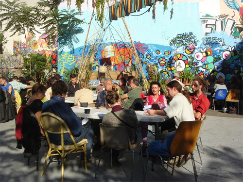 Vous avez d'ailleurs créé une forme de coordination nationale... Il s'agit là encore d'une organisation très souple. Nous avions besoin de réfléchir ensemble et de construire une forme de représentation collective du mouvement. Et cela pour répondre aux demandes du réseau international, de groupes locaux et de partenaires potentiels. Un groupe de liaison de 12 personnes volontaires, venant de toute la France, s'est donc organisé. Nous avons créé un site internet, qui sert de boîtes à idées pour le mouvement, et qui recense les initiales locales comme les compétences des membres du réseau. Par ailleurs, nous organisons pour les groupes locaux des conférences, des formations et des rencontres nationales. Ces dernières se font souvent en partenariat, en nous associant par exemple à des événements « amis » [119]. Nous réfléchissons maintenant à essaimer ces actions d'animation et de coordination au niveau régional.