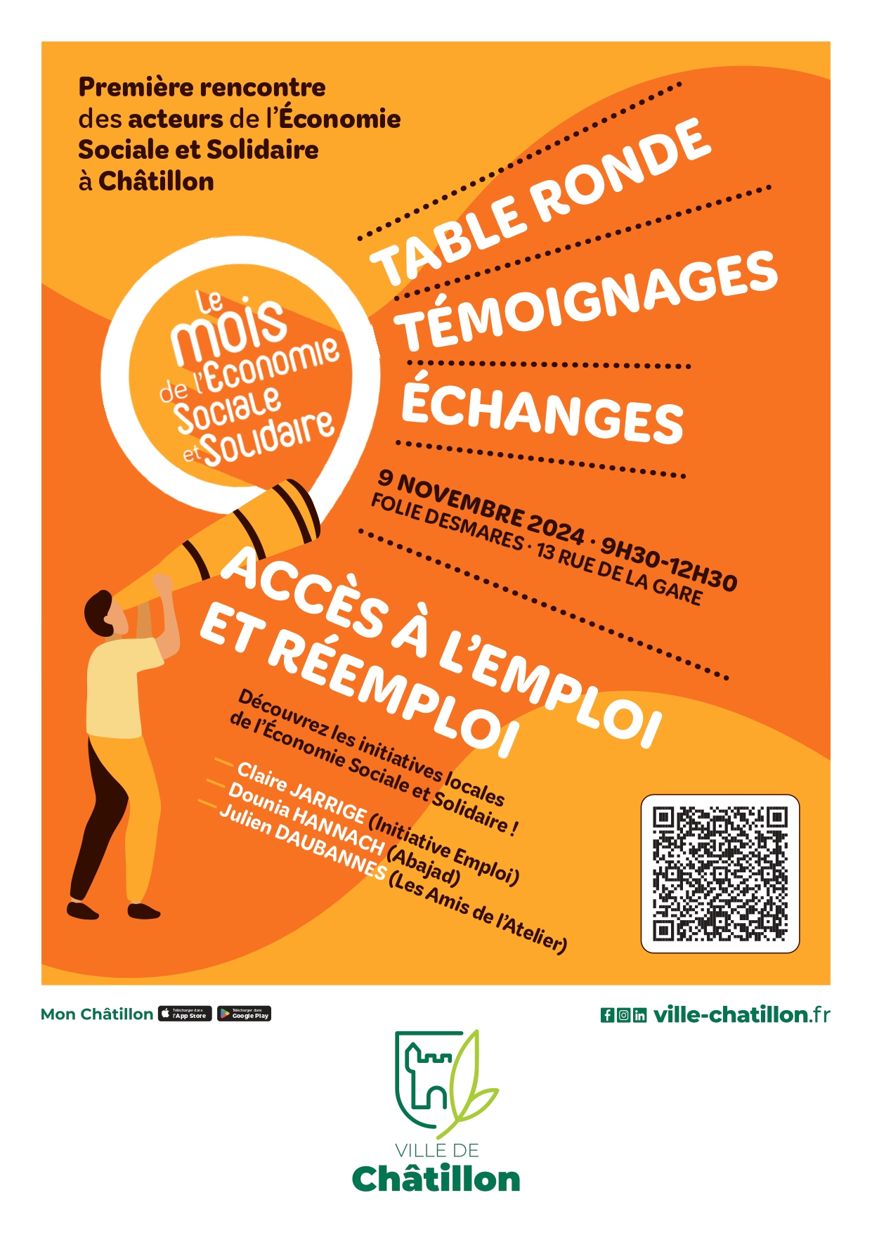 Autour d’une table ronde, plusieurs associations châtillonnaises de l’ESS partageront leurs expériences et échangeront autour des enjeux clés de l’accès à l’emploi et du réemploi. Ces témoignages concrets mettront en lumière des actions avec une attention particulière portée à l'insertion professionnelle et à l'impact social : les reconversions professionnelles, l’accompagnement solidaire pour les publics en difficulté et l’intégration professionnelle des personnes en situation de handicap.