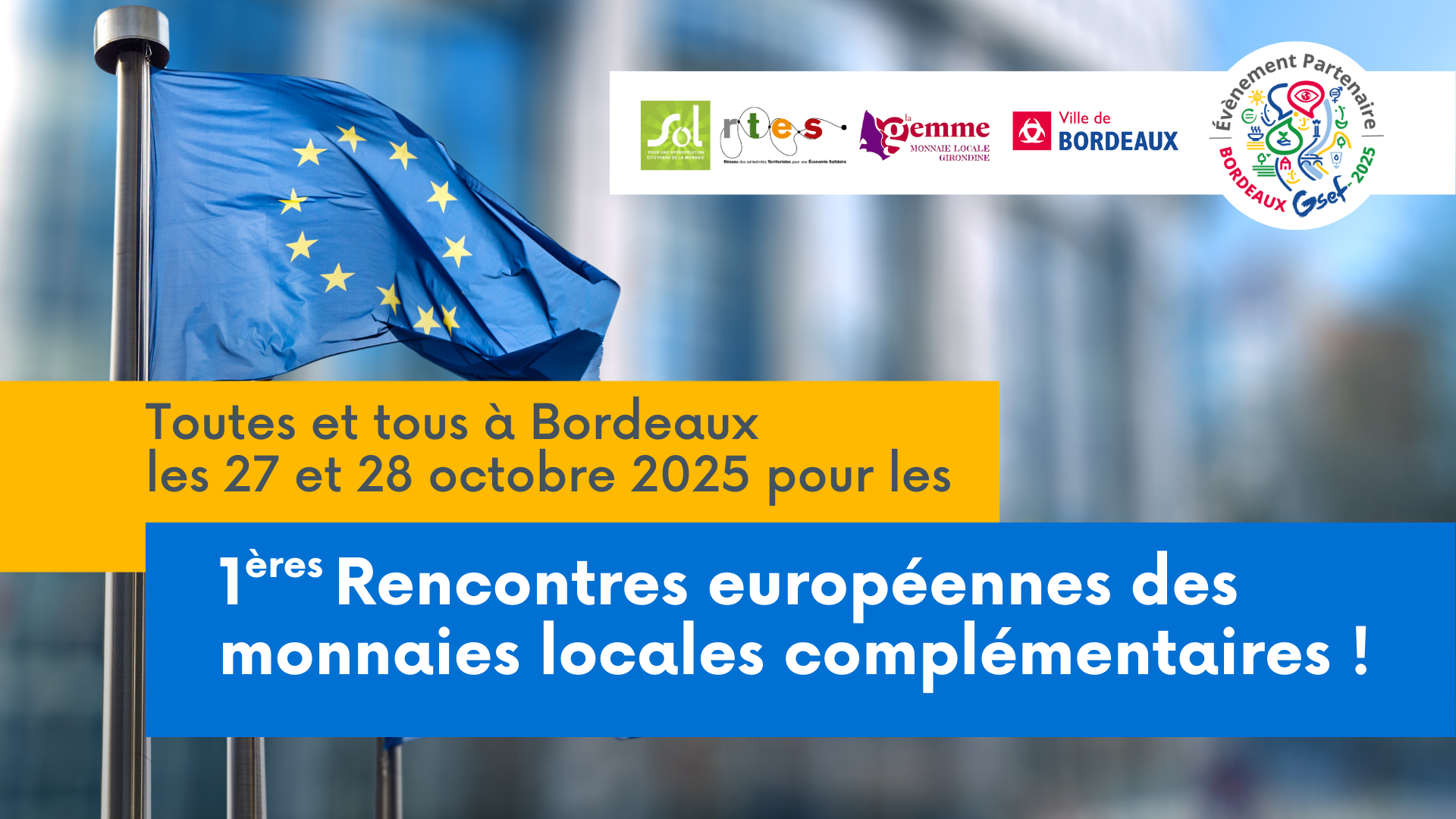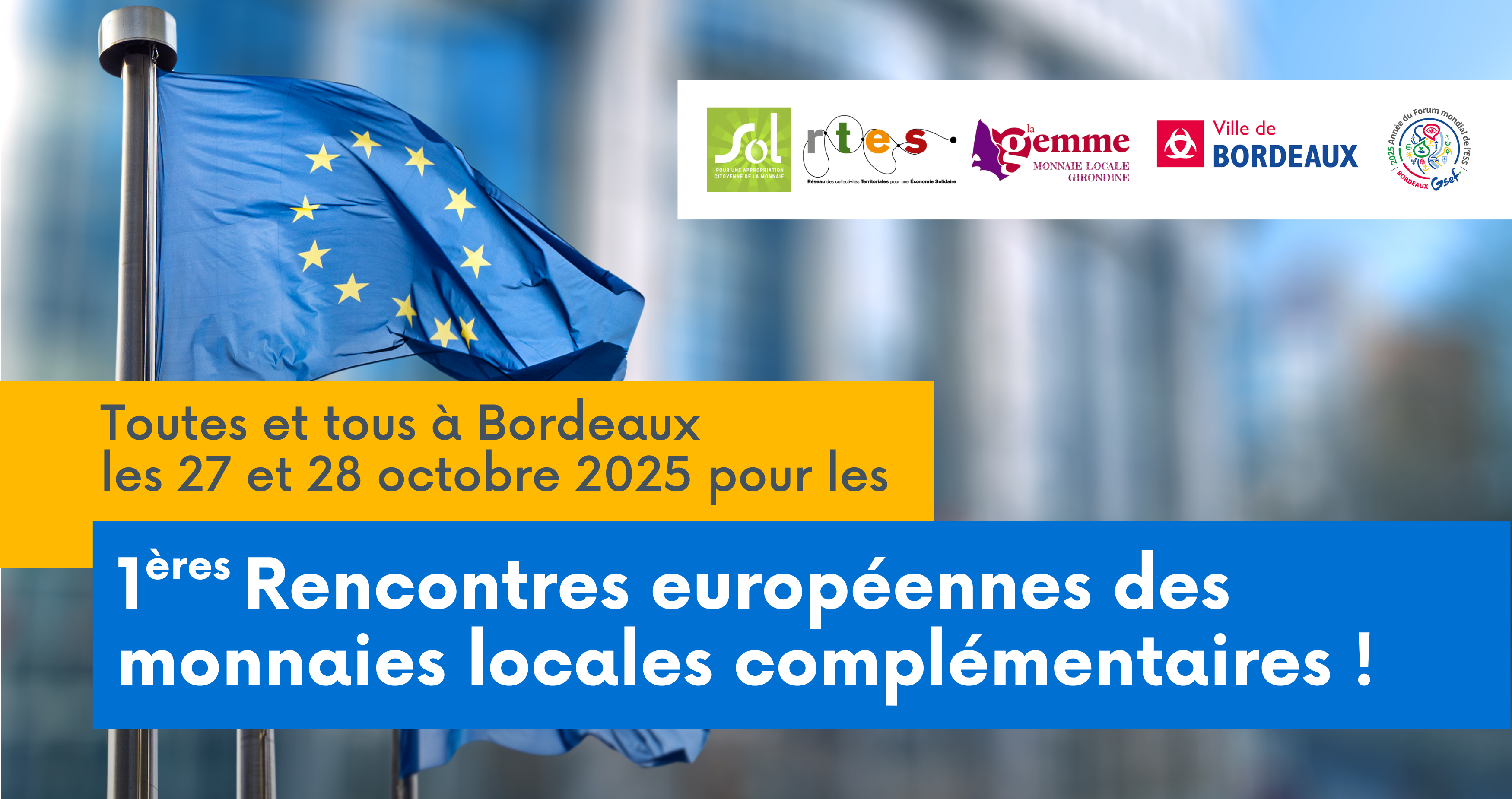 Les premières Rencontres européennes des monnaies locales complémentaires se tiendront à Bordeaux, les lundi 27 et mardi 28 octobre 2025, à l’Athénée municipal, en amont du Forum mondial de l’Économie sociale et solidaire – Bordeaux GSEF 2025, qui rassemblera plusieurs milliers de participants et proposera notamment un atelier dédié aux monnaies locales.