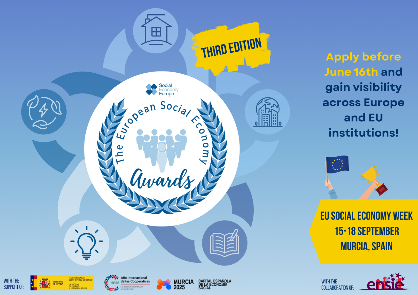 Un jury équilibré, composé d'experts en économie sociale, de chercheurs et de représentants des institutions européennes, sélectionnera trois finalistes pour chaque catégorie. Un membre de chaque organisation finaliste sera invité au gala de remise des prix de la semaine européenne de l'économie sociale, qui se tiendra du 15 au 18 septembre à Murcie (Espagne).