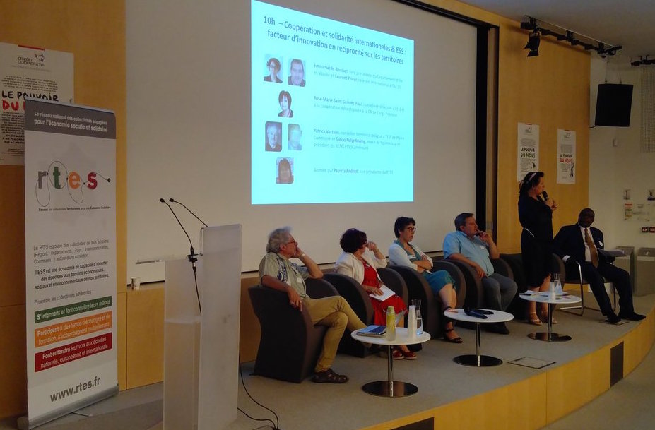 - 1ère table-ronde sur les facteurs d'innovation en réciprocité sur les territoires, animée par Patricia Andriot, vice- présidente du RTES ; avec Emmanuelle Rousset, vice-présidente du Département d’Ille-et-Vilaine et Laurent Prieur, référent international à Tag 35 ; Rose-Marie Saint Germès Akar, conseillère déléguée à l’ESS et à la coopération décentralisée à la CA de Cergy-Pontoise ; Patrick Vassallo, conseiller territorial délégué à l’ESS de Plaine-Commune et Tobias Ndije Mveng, maire de Ngomedzap et président du REMCESS (Cameroun) :