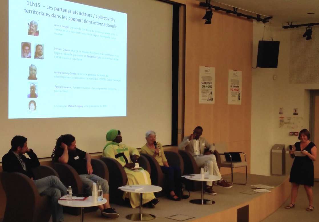 - 2ème table-ronde sur les partenariats acteurs / collectivités territoriales, animée par Mahel Coppey, vice-présidente du RTES ; avec Annie Berger, présidente des Amis du printemps arabe et de la Tunisie ; Sylvain Davila, chargé de mission Relations internationales de la Région Nouvelle-Aquitaine et Benjamin Coly, co- directeur de la CRESS Nouvelle Aquitaine ; Aminata Diop Samb, directrice générale du Fonds de développement et de solidarité municipal FODEM, Dakar (Sénégal) ; et Pascal Kouamé, Solidarité Laïque :
