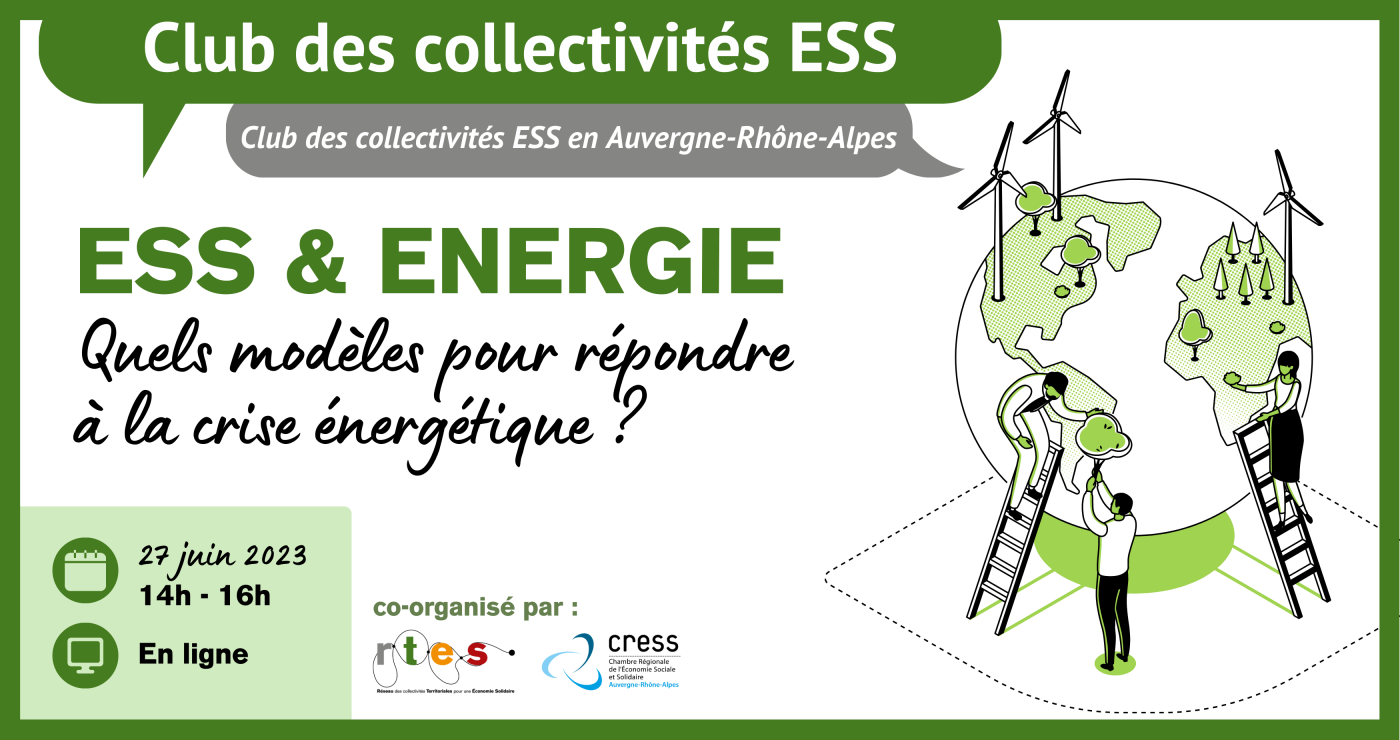 Le RTES et la Chambre Régionale de l'Economie Sociale et Solidaire (CRESS) Auvergne-Rhône-Alpes co-organisaient le club des collectivités engagées pour l'ESS en Auvergne-Rhône-Alpes le 27 juin 2023, de 14h à 16h, en visioconférence. Une vingtaine de participants se sont retrouvés autour de la thématique : « Répondre à la crise énergétique avec les structures de l'ESS ». Retrouvez le diaporama en cliquant ici.
