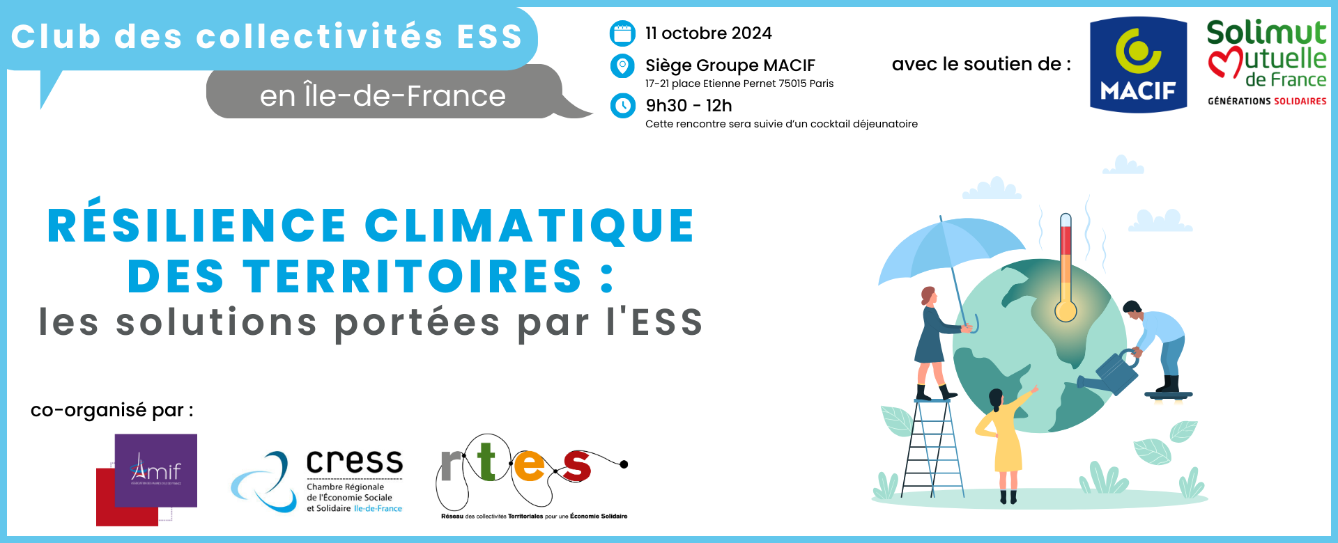 Cette rencontre vous est proposée dans le cadre du Club des collectivités ESS en Île-de-France, un projet porté par la CRESS Ile-de-France, le RTES et l'AMIF, et soutenu par la MACIF et la Solimut.