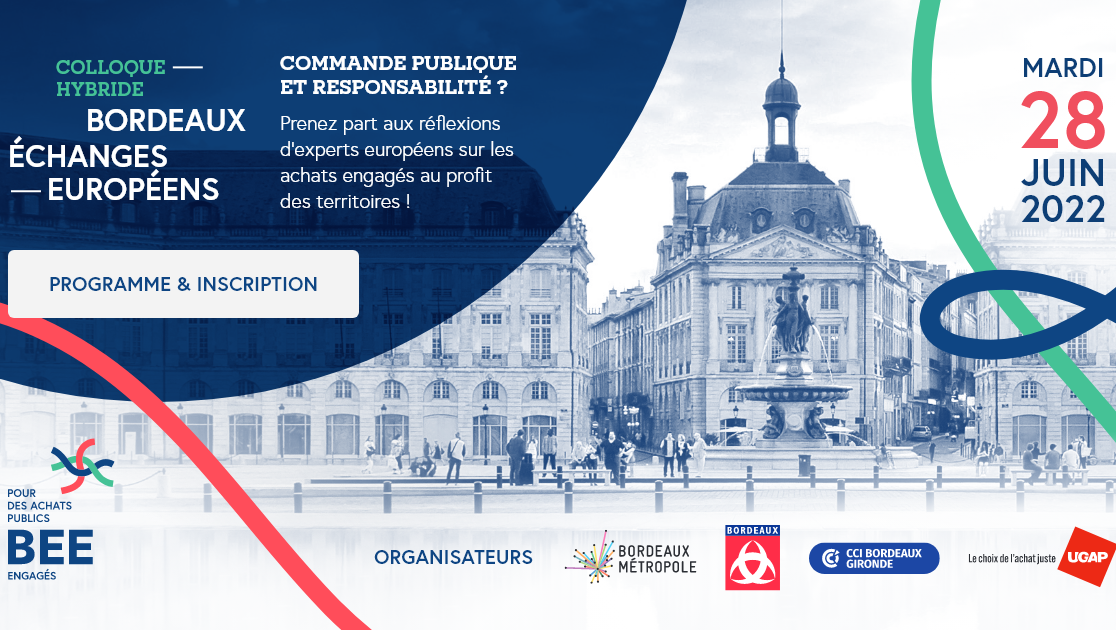 Le 28 juin prochain, Bordeaux accueillera l’événement BEE, ou « Bordeaux Echanges Européens – Pour des achats publics engagés » au Palais de la Bourse.