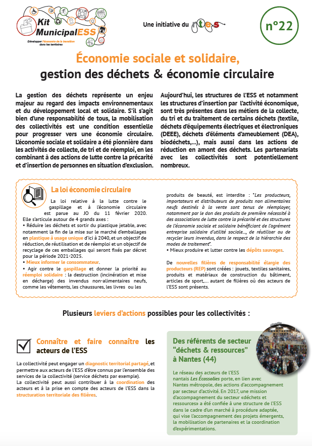 Fiche n°22 : ESS, gestion des déchets & économie circulaire jeu 11/06/2020 - 12:09 Téléchargez la fiche n°22 : Économie sociale et solidaire, gestion des déchets & économie circulaire.