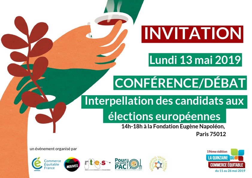 Commerce Équitable France en partenariat avec le MOUVES, le RTES, la plateforme Pour une autre PAC et le collectif Repenser les filières organise une conférence d'interpellation des candidats aux élections européennes le 13 mai 2019 : Inégalités et changement climatique : Quelle Europe pour faire face à ces enjeux planétaires ?