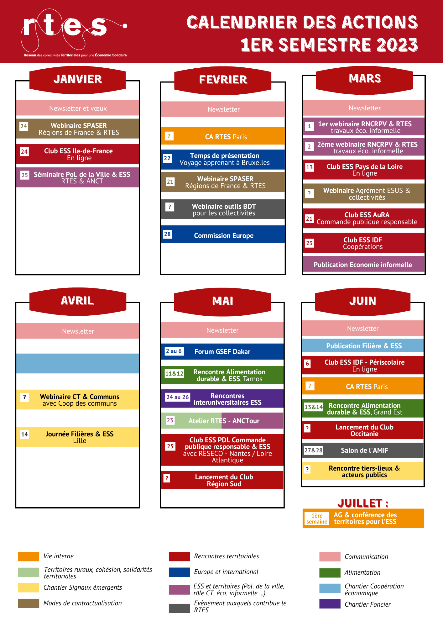 Le RTES organise régulièrement des journées d’échanges, thématiques ou en régions. Ces journées sont coorganisées avec les collectivités adhérentes, et ouvertes sous condition aux collectivités non adhérentes, ainsi qu’aux acteurs de l’ESS et aux partenaires. Le RTES organise également des sessions de formation et de partages d’expériences entre collectivités au niveau régional en lien notamment avec les CRESS. Le RTES développe par ailleurs des partenariats avec le CNFPT et Idéal CO.