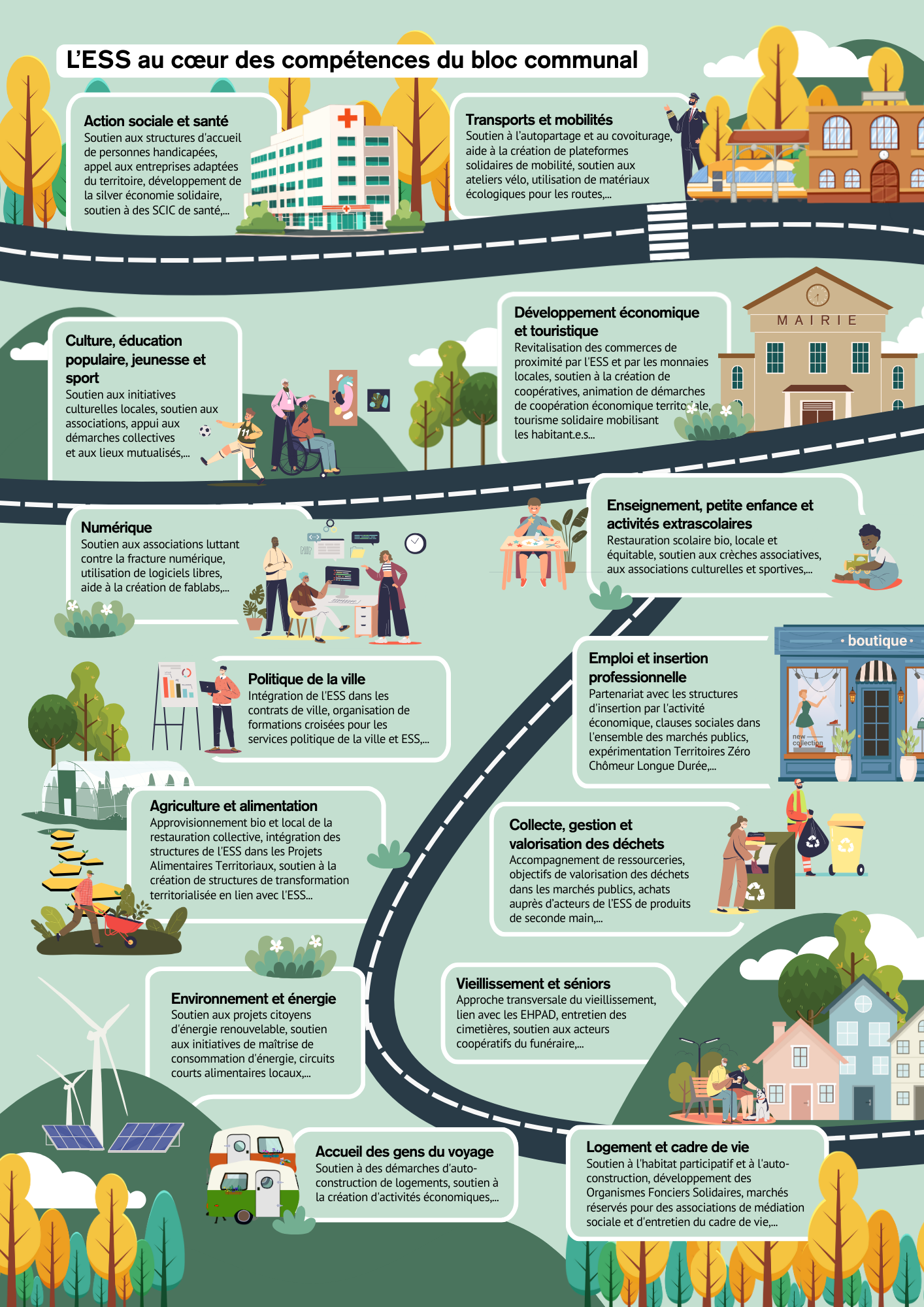 Les acteurs de l’ESS peuvent contribuer à l’ensemble des politiques mises en place par le bloc communal, et celui-ci dispose de nombreuses possibilités pour accompagner les acteurs de l’ESS, que ce soit au niveau des communes ou de leurs groupements. Le schéma ci-contre illustre les principales compétences du bloc communal et le lien possible avec l’ESS.