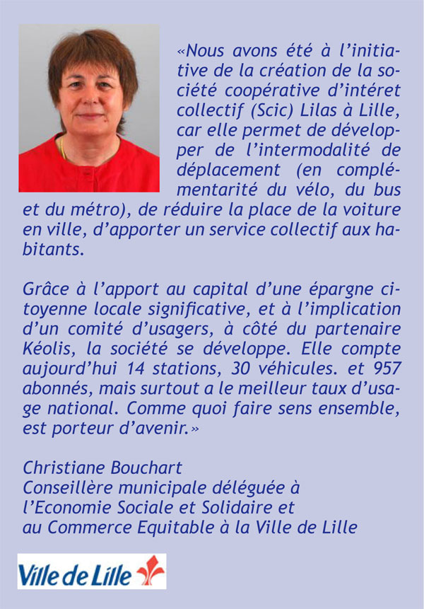créer les conditions favorables en favorisant, par exemple, le déploiement des transports publics couplé à une restriction du stationnement. Une collectivité peut aussi mener une politique de densification urbaine ou réduire le coefficient de places de parking par logement ou par entreprise. D’autre part, un service d'autopartage atteint un équilibre financier au bout de 7 ans. Le soutien des collectivités sur ces premières années est donc indispensable. Cet engagement peut prendre plusieurs formes : une aide financière, une souscription au capital, mais aussi l'utilisation professionnelle du service par les agents de la collectivité. Enfin, ce sont les collectivités qui accordent les emplacements de stationnements réservés dans la ville. Ces emplacements sont importants, ils rendent visibles nos services.