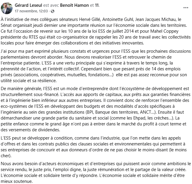 La présence de nombreux député.es et sénateurs.rices tout au long de la journée témoigne de la mobilisation des parlementaires. Merci pour leurs interventions à Gérard Leseul, député et président du groupe d'études sur l'ESS à l'Assemblée Nationale, à Audrey Linkenheld, sénatrice, et à Valérie Rossi, députée des Hautes-Alpes et membre du Conseil Supérieur de l'ESS.