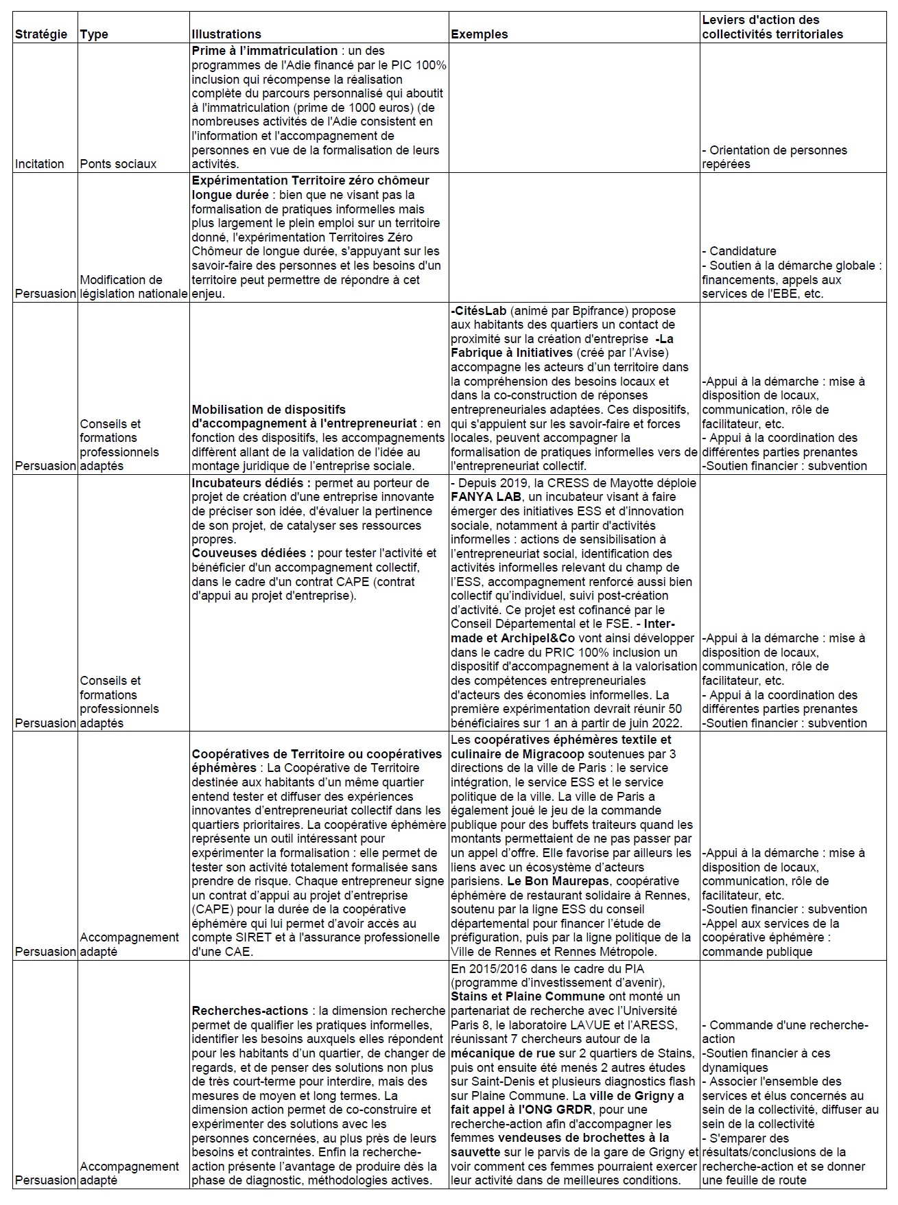 En complément des mesures de dissuasion comme l'interdiction de la vente à la sauvette (avec exceptions à l'occasion de vides-greniers, le 1er mai, etc.) ou de persuasion telle la loi de 2009 instaurant le statut d'autoentrepreneur ou le crédit d'impôt pour l'emploi d'un salarié à domicile, le tableau ci-dessous recense quelques outils français d'incitation et de persuasion pour la formalisation de pratiques informelles par ou vers l'économie sociale et solidaire et met en évidence les leviers dont disposent les collectivités pour soutenir ces différents outils.