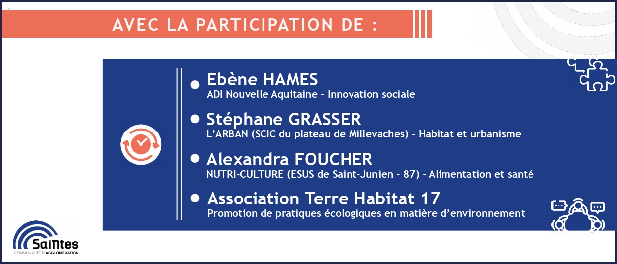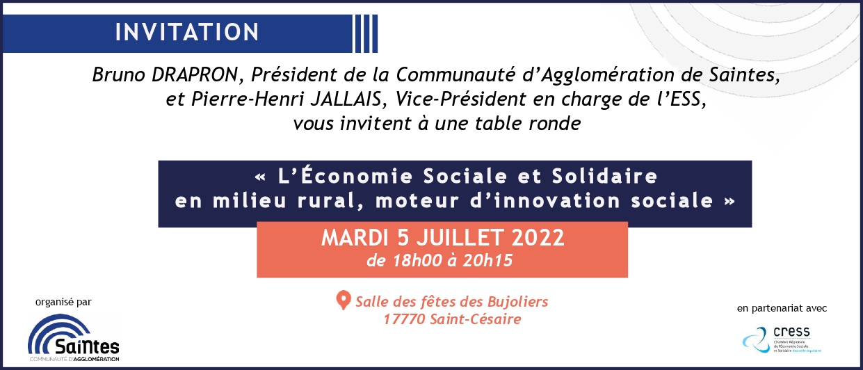 Le Président de la Communauté d’Agglomération de Saintes et son Vice-président en charge de l’Economie Sociale et Solidaire vous invitent à une soirée table-ronde : "L’ESS en milieu rural, moteur d’innovation sociale" mardi 5 juillet 18h à Saint Césaire.