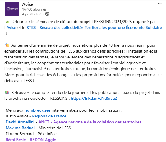 L’Avise et le RTES ont eu le plaisir d'organiser le séminaire de clôture du projet TRESSONS 2024/2025 (Territoires ruraux et économie sociale et solidaire, outils et nouvelles synergies) ce mardi 20 mai 2025 à la Ferme des Possibles à Stains (93). L’Avise et le RTES coaniment le projet TRESSONS 2024/2025, lauréat de l’appel à projets ANIMERA (Animation Nationale et Inter-régionale pour Mêler Enjeux Ruraux et Agricoles) porté par le Réseau National Agricultures et Ruralités (RNAR).