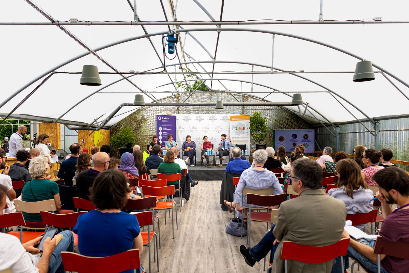Table ronde d'ouverture avec les partenaires du projet TRESSONS (de gauche à droite) : Cécile Leclair, directrice de l'Avise, Patricia Andriot, vice-présidente du RTES, Lucie Louessard, Réseau National Agricultures et Ruralités - Ministère de l'agriculture, Eric Rossi, Familles Rurales, Antoine Détourné, ESS France, Florent Bernard, Pôle InPact, et Fabrice Dalongeville, Association des Maires Ruraux de France - AMRF.