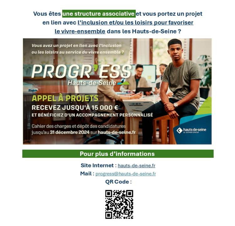 Le Département des Hauts-de-Seine encourage l'Economie sociale et solidaire sur son territoire avec son appel à projet Progr'ESS 2025. Ce dispositif vise à soutenir des initiatives locales à fort impact social, environnemental et à fort potentiel de développement. Pour cette 3ème édition, 2 axes thématiques sont dédiés aux initiatives portant sur l’inclusion pour un territoire plus solidaire (jeunesse & éducation, séniors & silver économie, handicap, alimentation solidaire), et les loisirs au service du vivre ensemble (art, culture, tourisme, sport).