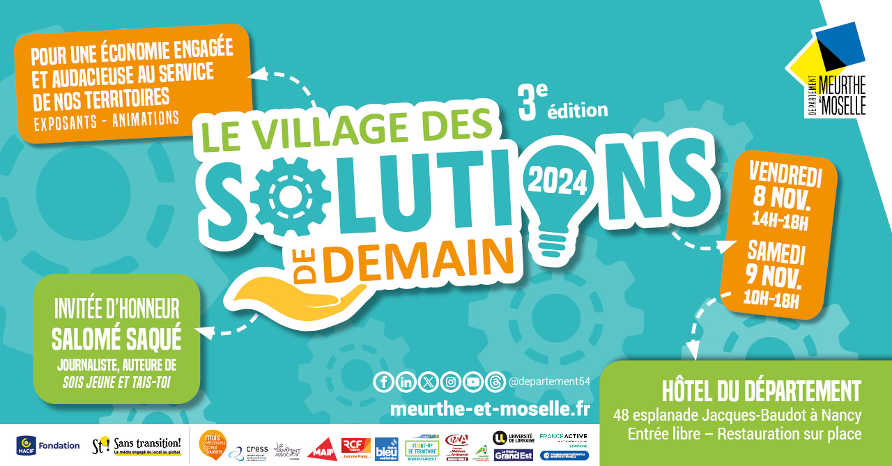 Le Conseil départemental de Meurthe-et-Moselle renouvelle le Village des Solutions de demain, le rendez-vous incontournable des acteurs & actrices de l'ESS et des entrepreneur.es engagé.es. Il se déroulera les vendredi et samedi 8 & 9 novembre 2024 à l’Hôtel du Département à Nancy, dans le cadre du Mois de l'ESS.