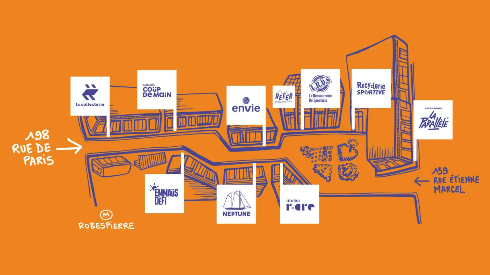 L’Atelier R-ARE, Emmaüs Coup de Main, Emmaüs Défi, Envie, La Collecterie, Neptune, La Ressourcerie du Spectacle, La Recyclerie sportive, le REFER : 9 associations spécialistes du réemploi solidaire font « village » dans une nouvelle venelle à Montreuil, de la rue de Paris à la rue Étienne Marcel.  Situé au sein de la ZAC de la Fraternité, La Venelle s’inscrit dans un projet immobilier et architectural plus large, lauréat de l’arc de l’innovation. Les boutiques jalonnent, sur près de 1800 m², un parcours piéton qui comprend un jardin et un café resto.