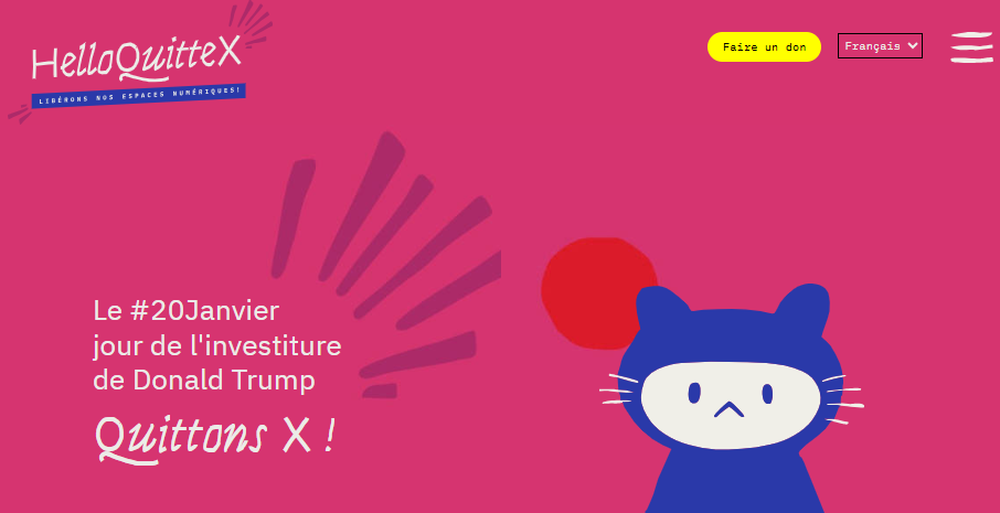 HelloQuitteX est "un mouvement meta-politique et apartisan qui aide les citoyens à se réapproprier des espaces numériques compatibles avec des démocraties fonctionnelles." Il incite un départ en masse le 20 janvier 2025 de nombreux internautes du réseau social X, détenu par Elon Musk, qui sera un pilier du nouveau gouvernement Trump.