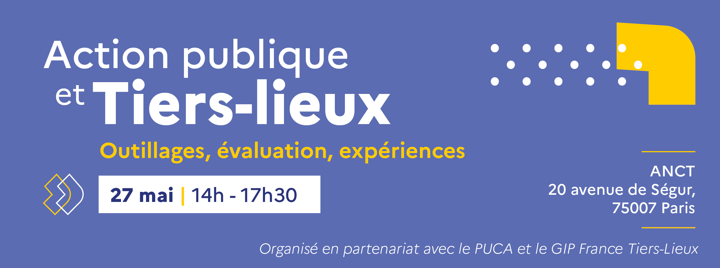 L'Agence Nationale de la Cohésion des Territoires, le Plan Urbanisme Construction Architecture (PUCA) et France Tiers-Lieux organisent une rencontre le lundi 27 mai de 14h à 17h30 intitulée « Action publique et Tiers-lieux : outillages, évaluation, expériences » dans le Grand Auditorium de l'Agence Nationale des la Cohésion des Territoires à Paris au 20 avenue de Ségur .