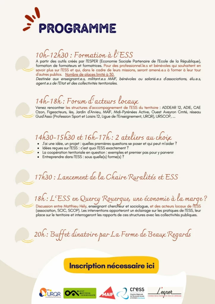 Le mardi 2 décembre 2025, au domaine de Laurière à Villefranche-de-Rouergue, Ouest Aveyron Communauté, la MAIF et l'URQR organisent une journée conviviale de mise en valeur et d'échanges autour d'initiatives de l'Economie Sociale et Solidaire locales.