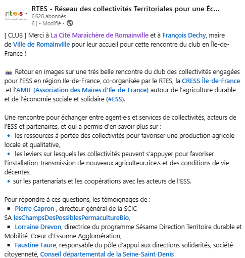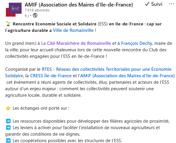 Le Réseau des collectivités Territoriales pour une Economie Solidaire (RTES), la Chambre Régionale de l'Economie Sociale et Solidaire (CRESS) Ile-de-France et l'Association des Maires d'Ile-de-France (AMIF) ont organisé une rencontre du Club des collectivités engagées pour l'ESS en région Ile-de-France :
