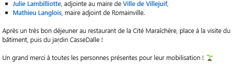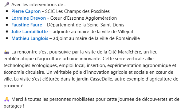 L'après-midi était consacrée à la visite de la Cité Maraîchère, du jardin CasseDalle (jardin nourricier) et du jardin Gagarine, projet d'agriculture avec un verger, des potagers et un espace de transformation alimentaire dans un quartier en renouvellement dans le cadre de l'AAP Quartier Fertile de l'ANRU.