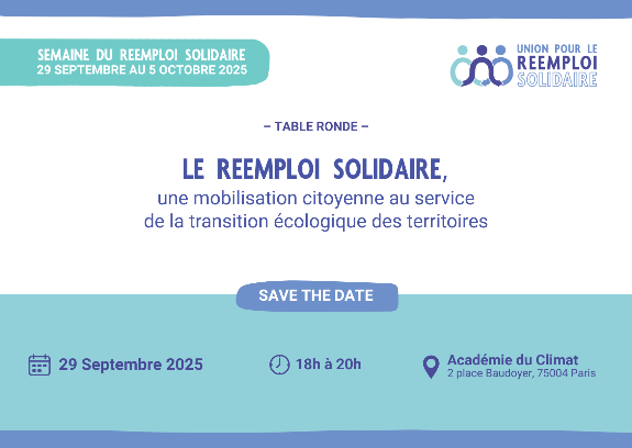 L'Union pour le Réemploi Solidaire organise un événement de lancement de l'édition 2025 de la Semaine du Réemploi Solidaire qui aura lieu à l'Académie du Climat le 29 septembre 2025 de 18h à 20h. Pour vous inscrire à l'évènement de lancement, remplissez ce formulaire.