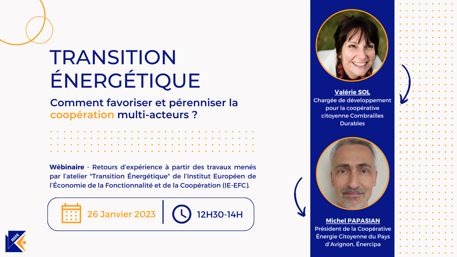 L’Institut Européen de l’Économie de la Fonctionnalité et de la Coopération (IE-EFC) vous donne rendez-vous pour son webinaire "Transition énergétique : Comment favoriser et pérenniser la coopération multi-acteurs ?" le 26 janvier de 12h30 à 14h via zoom.